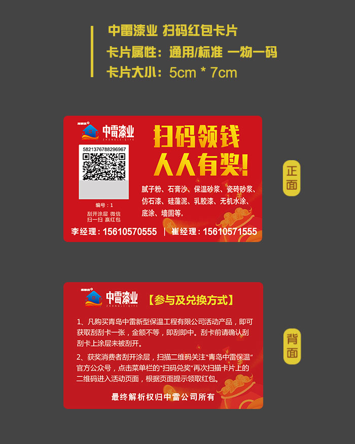 1、凡购买青岛中雷新型保温工程有限公司活动产品,即可获取刮刮卡一张,金额不等,即刮即中。刮卡前请确认刮刮卡上涂层未被刮开。